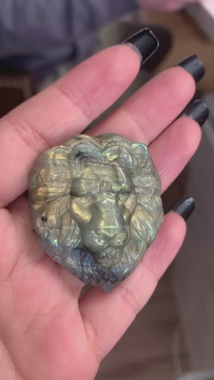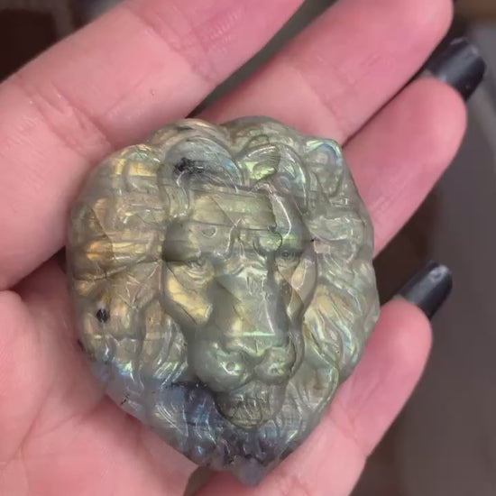 Unleash your inner king with our Labradorite Carving! This unique piece features a fierce lion head carved from stunning labradorite stone. Channel your inner strength and courage with this one-of-a-kind carving. (Warning: may inspire loud roars of joy.)