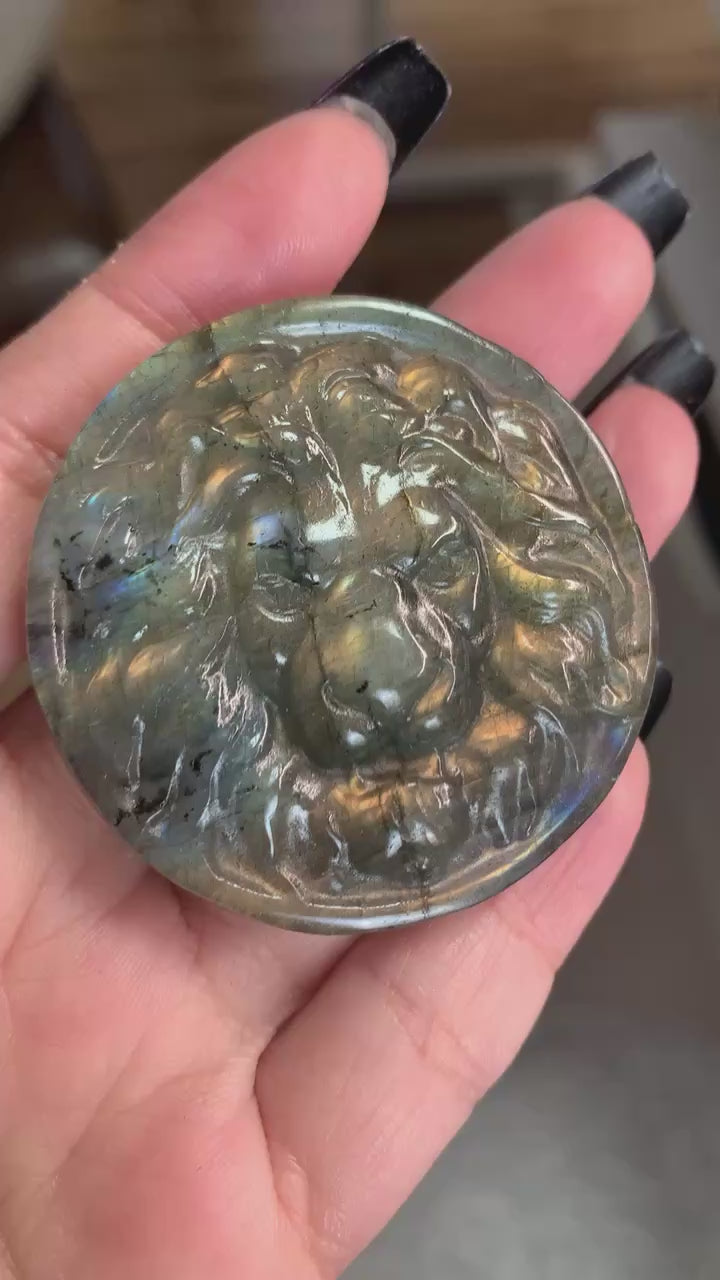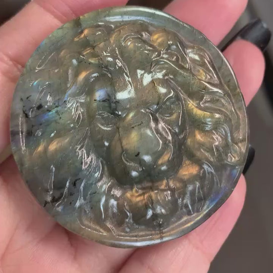 Unleash your inner king with our Labradorite Carving! This unique piece features a fierce lion head carved from stunning labradorite stone. Channel your inner strength and courage with this one-of-a-kind carving. (Warning: may inspire loud roars of joy.)