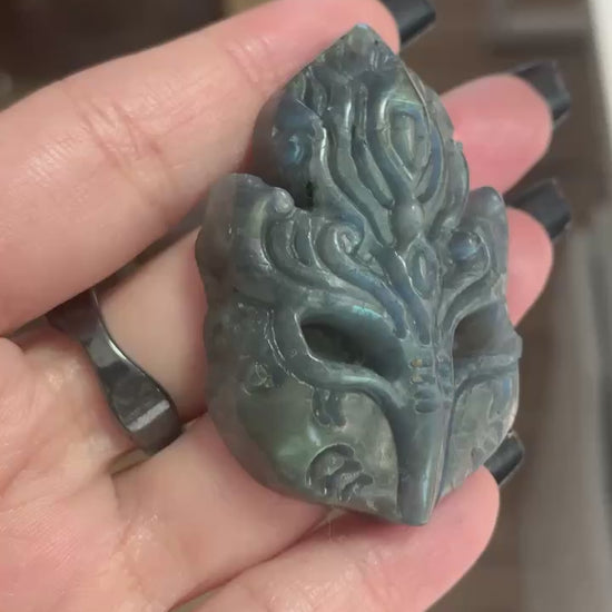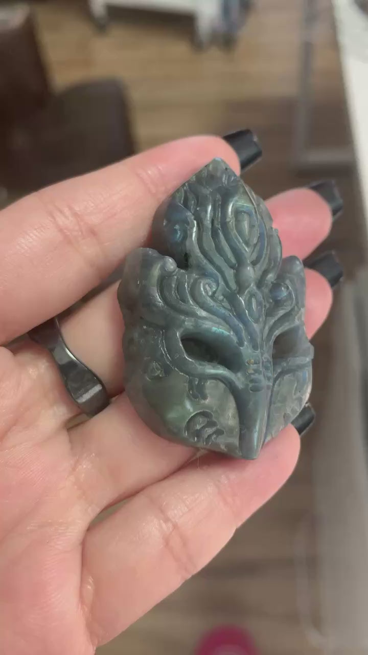 Rock your style with the unique Labradorite Carving (LABCAV021)! This one-of-a-kind Lab Carving Mask will add some playful flair to your look. Embrace the fun and quirky vibes of this hand-carved piece, perfect for those who don't take themselves too seriously. Stand out from the crowd with this must-have accessory!