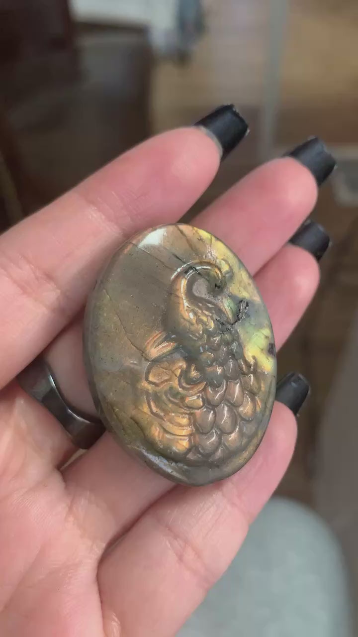 Add a unique touch to your collection with this Labradorite Carving (LABCAV028). The lab carving showcases a stunning peacock orange flash, making it a standout piece. Let the natural beauty of this carving shine through in your home or office.